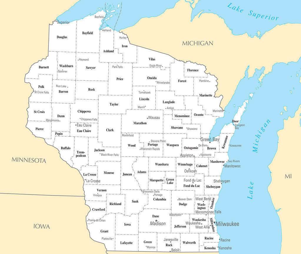 Map of Wisconsin WI County Map with selected Cities and Towns